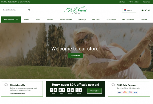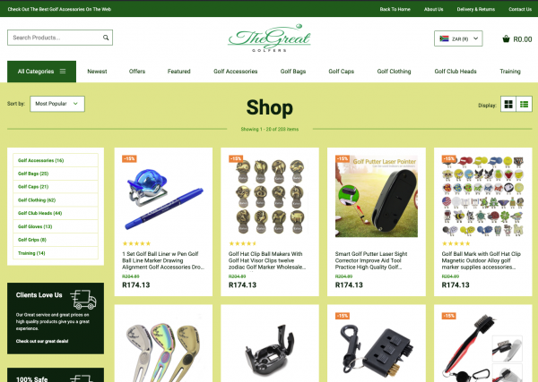 A fantastic Golf and Accessories store with over 300 products with multiple product categories including golf clubs, golf gloves, golf clothes, golf caps and accessories through your dropshipping store, with all the products hand chosen to complement each other without them being overly available in the local market to ensure you keep your edge of uniqueness, with worldwide delivery.